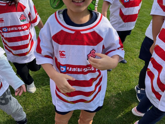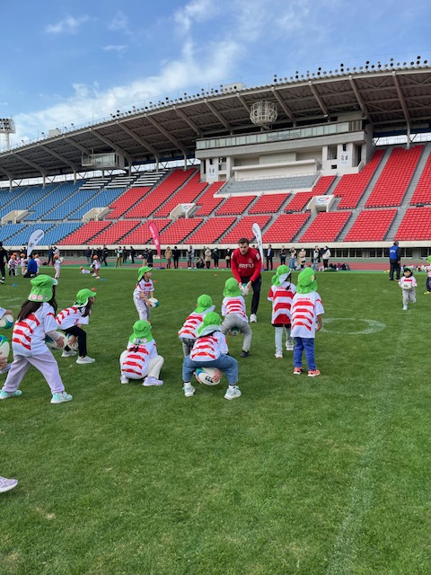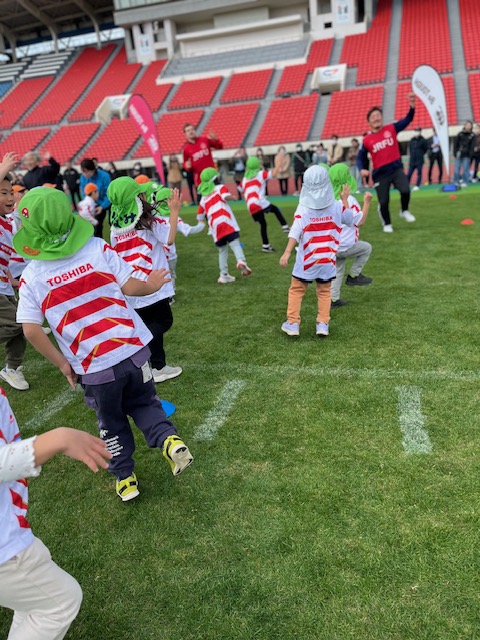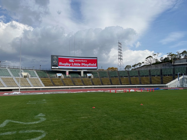 ユニバー記念競技場にはいると素敵なラグビーユニホームに着替え、柔らかい芝生の上に立ち、いざ体験へ!