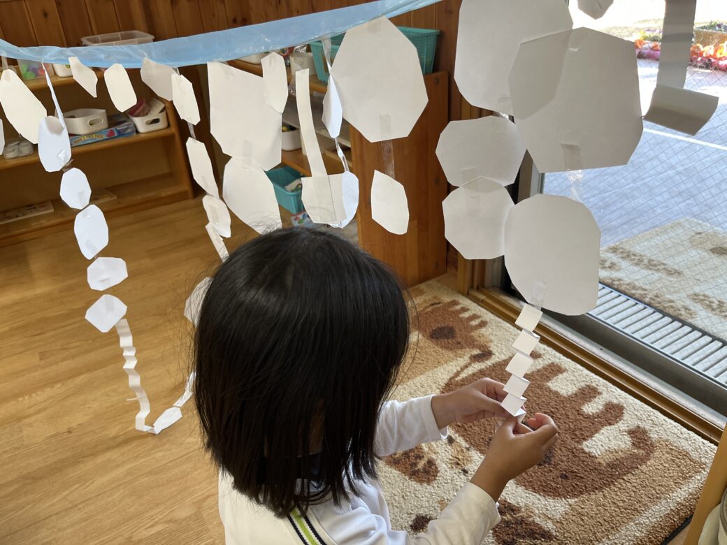 白い画用紙をはさみでチョキチョキ。だんだんとはさみの